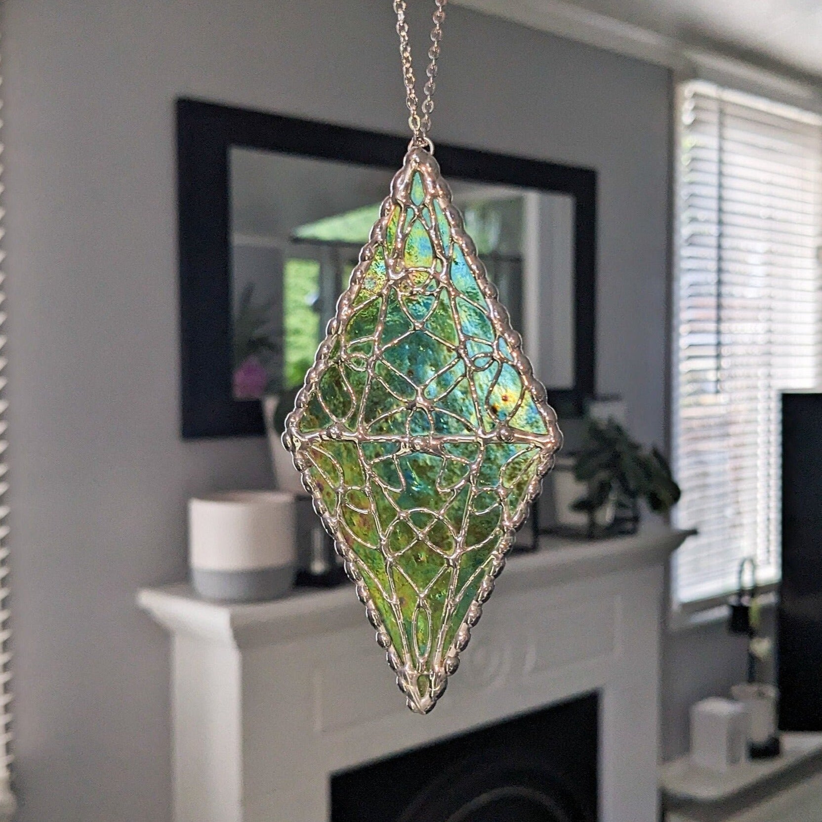 Green iridised glass & sparkly solder crystal hanging suncatcher. Also available as a plant stake (see photos)