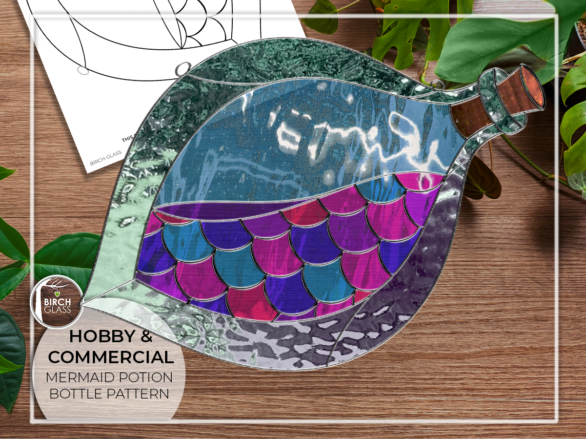 Dive into creativity with our mesmerizing mermaid potion bottle stained glass pattern! Use your favorite iridised glass to create something truly magical.