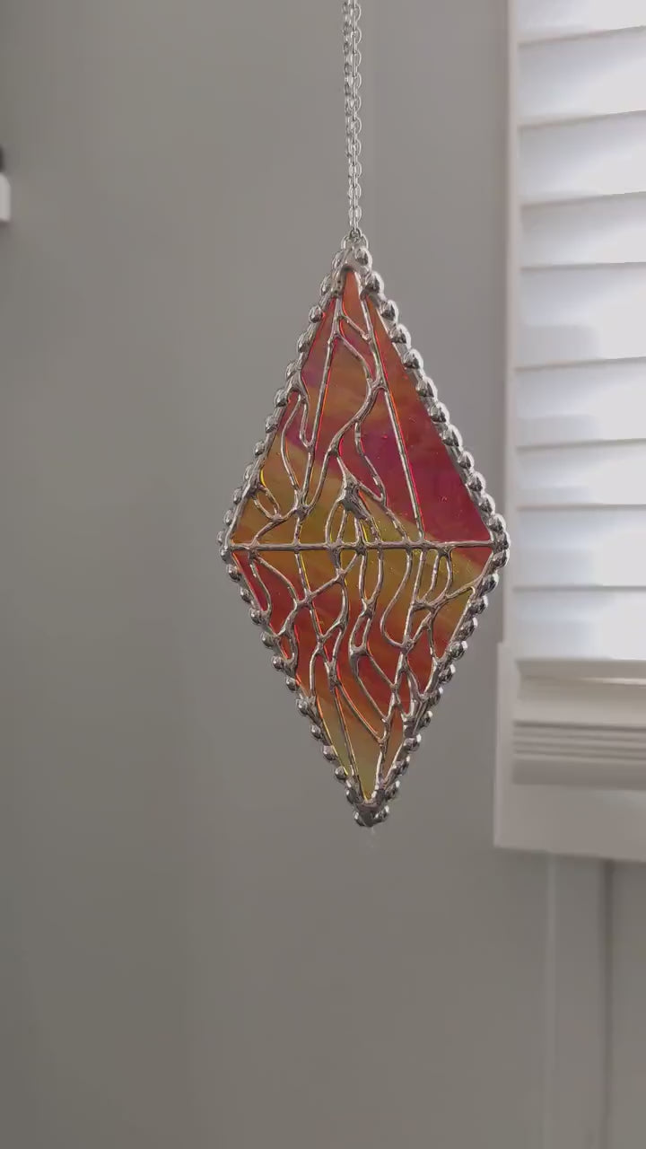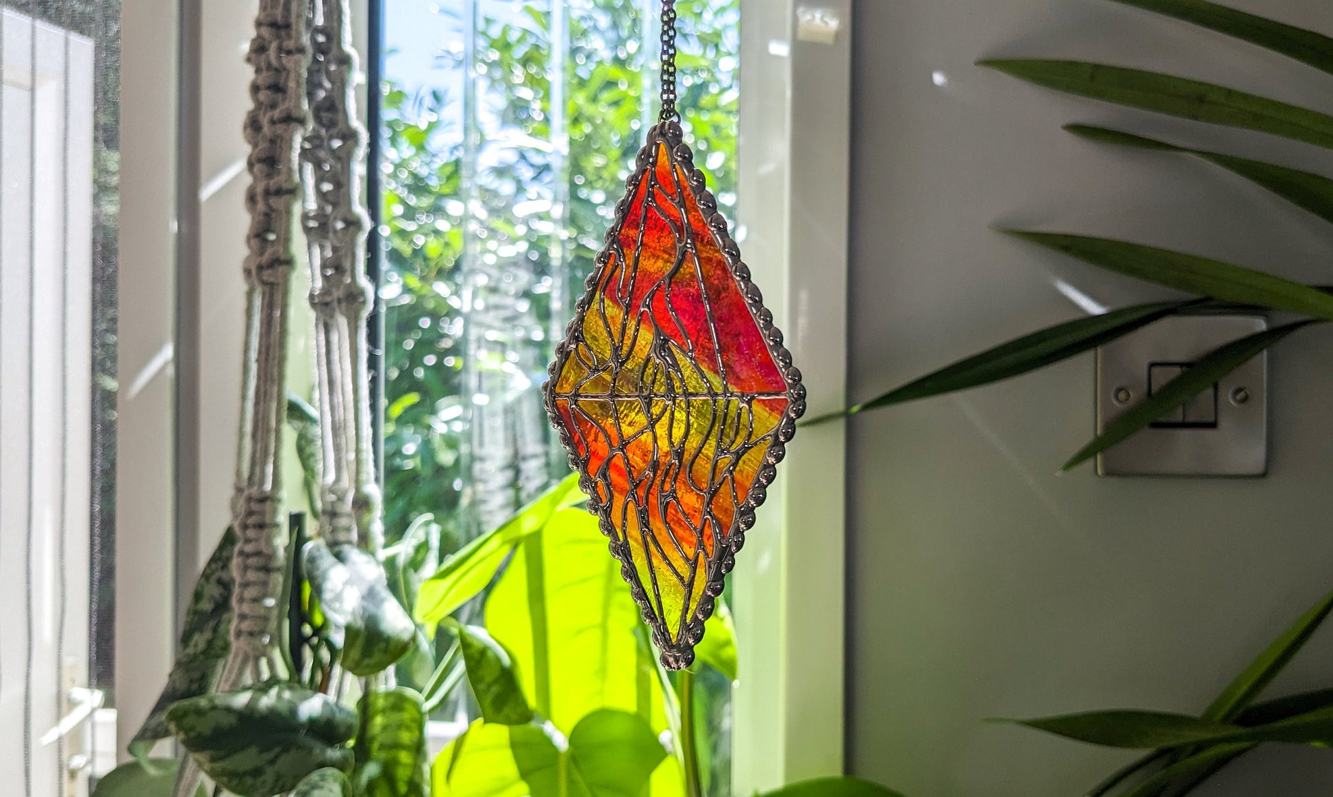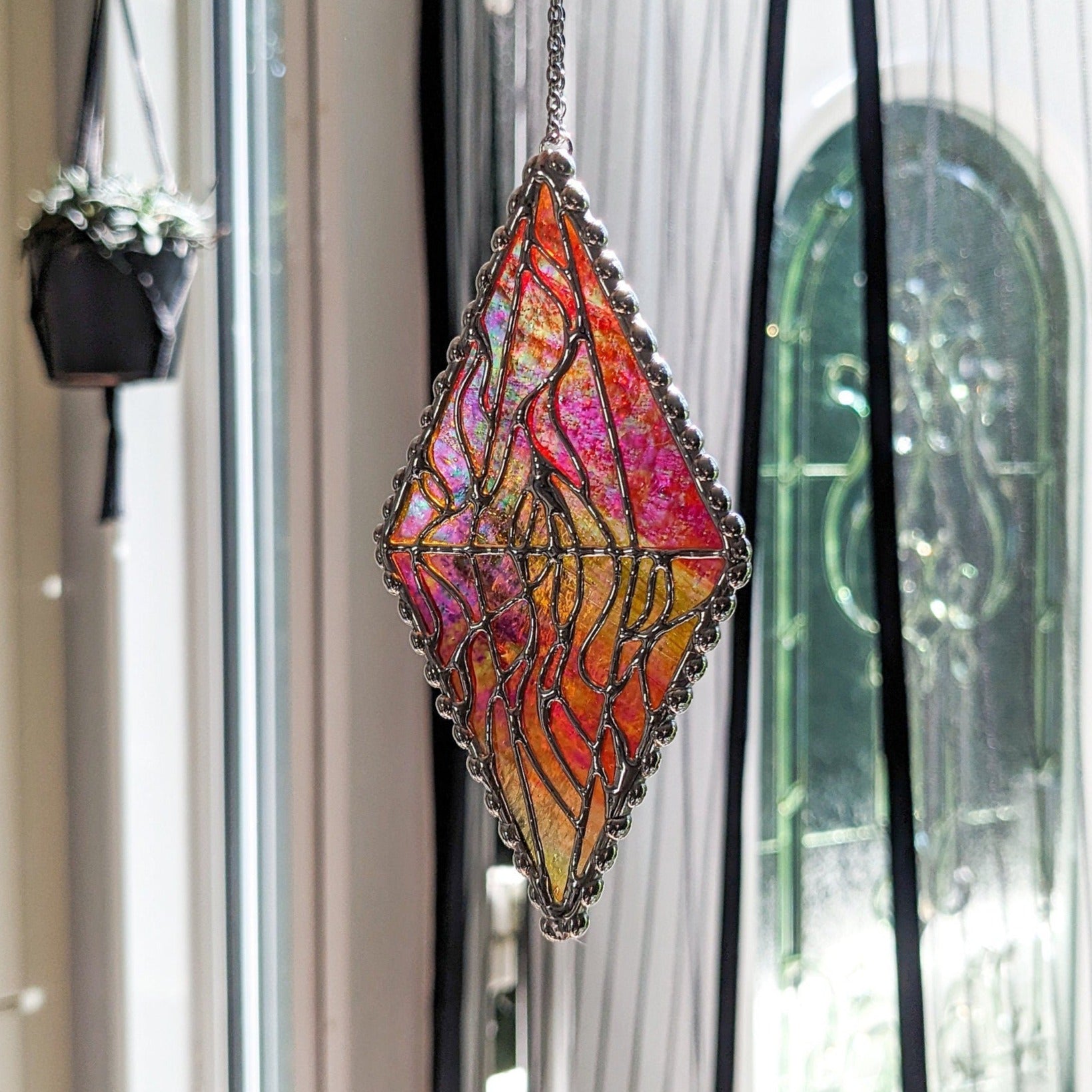 Red, yellow & orange iridized glass & sparkly solder crystal hanging suncatcher. - Also available as a plant stake (see photos)